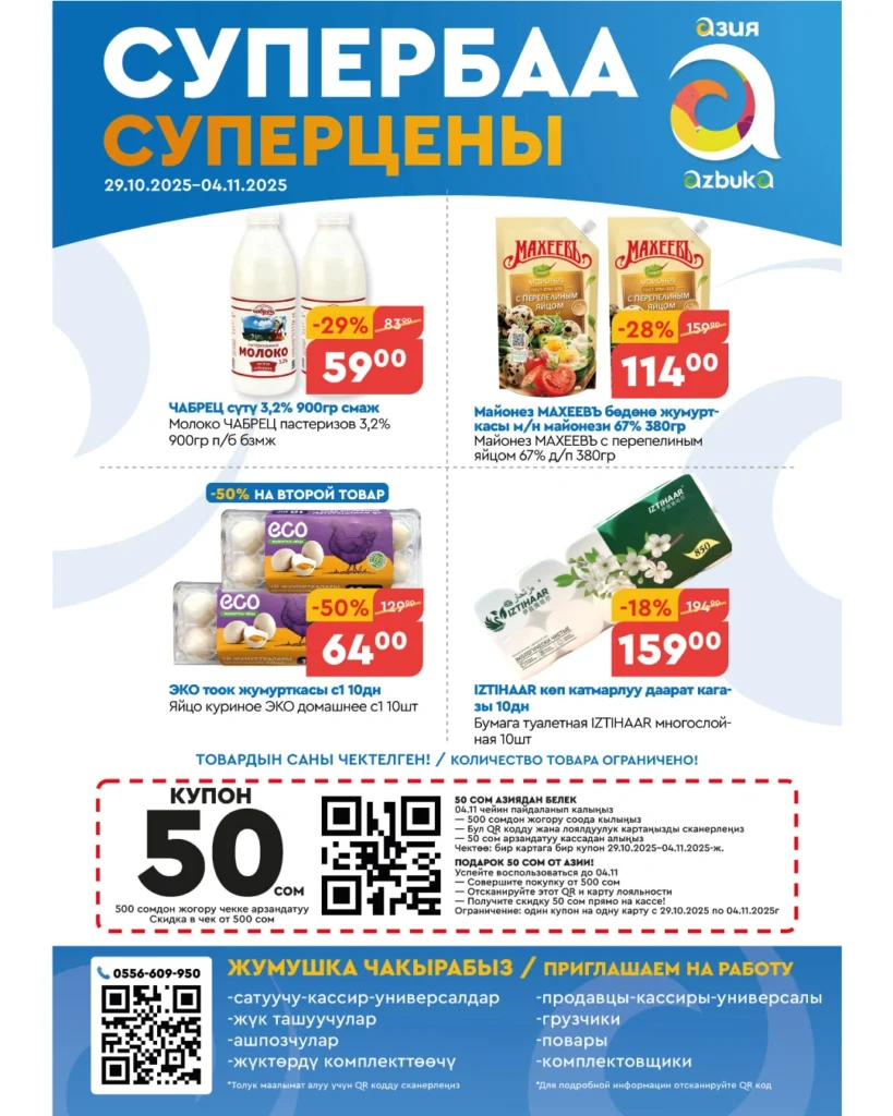 Купон на скидку -50 сом Действует до 29.10.2025 Покажите карту лояльности и QR-код кассиру при покупке Купон действует только для единоразовой покупки товаров и для 1 человека С 22 по 28 октября получите скидку -50 сом при покупке от 500 сом Скидка работает во всей сети магазинов «Азия» и «Азбука» Купон не суммируется с другими […]